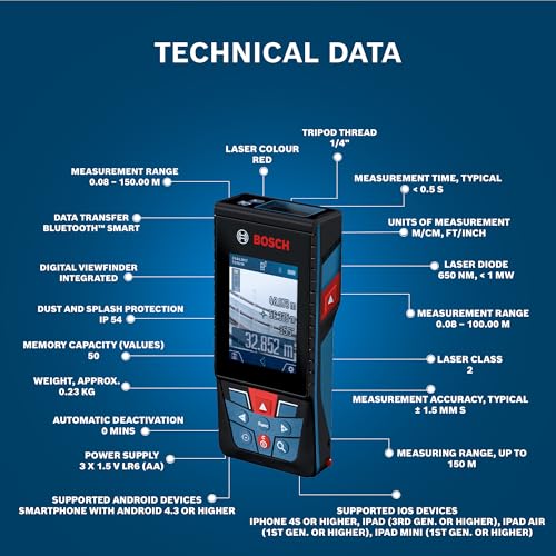 Laser diode – 650nm, < 1 mW , Laser class – 2; Measurement accuracy typical - ± 1.5 mm
