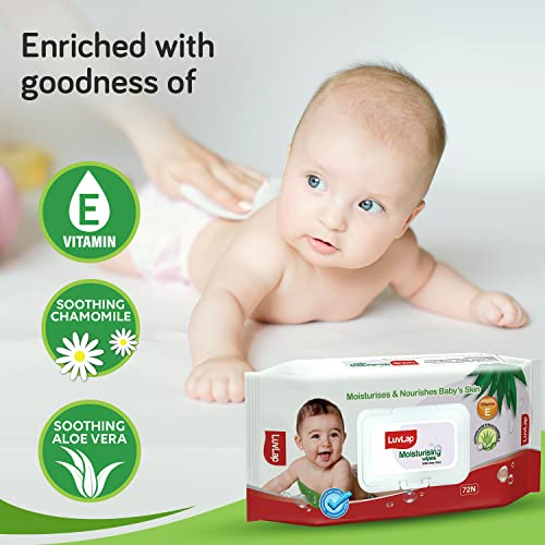 LuvLap Paraben Free wipes for baby skin with Aloe Vera, Fragrance Free, pH Balanced, Dermatologically Safe, Baby Wipes Rich in Vitamin E & chamomile extract, 72 Wipes With Lid Pack