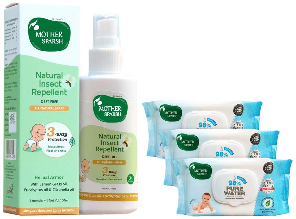 Mother Sparsh 98% Water Based Baby Wipes I Plant made Wet Wipes I 80 Pcs wipes with lid, Pack of 3 & Mother Sparsh Natural Insect Repellent Spray For Babies- 100ml