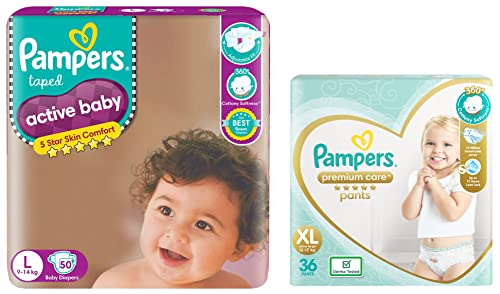 Pampers Active Baby Taped Diapers, Large size diapers, (LG) 50 count, taped style custom fit & Pampers Premium Care Pants, Extra Large size baby diapers (XL), 36 Count, Softest ever Pampers pants