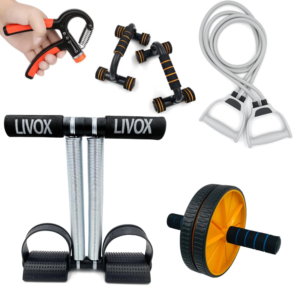 Home Gym Rquipment Combo Set: Includes 6 essential pieces – Tummy Trimmer, Toning Tube, 2 Hand Gripper, Skipping Rope, Pushup Stand, and Abs Wheel Roller for a full-body workout gym kit.