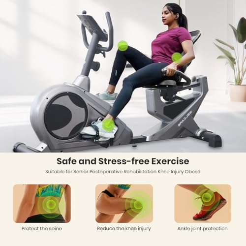 Crafted with Precision : Recumbent bike for seniors and adults prioritizes your well-being. Its contoured, cushioned seat and backrest provides lumbar support, ensuring a comfortable and strain-free workout session. The adjustable seat caters to all body types, allowing for a customization fit that encourages proper posture and reduces the risk of discomfort or strain.